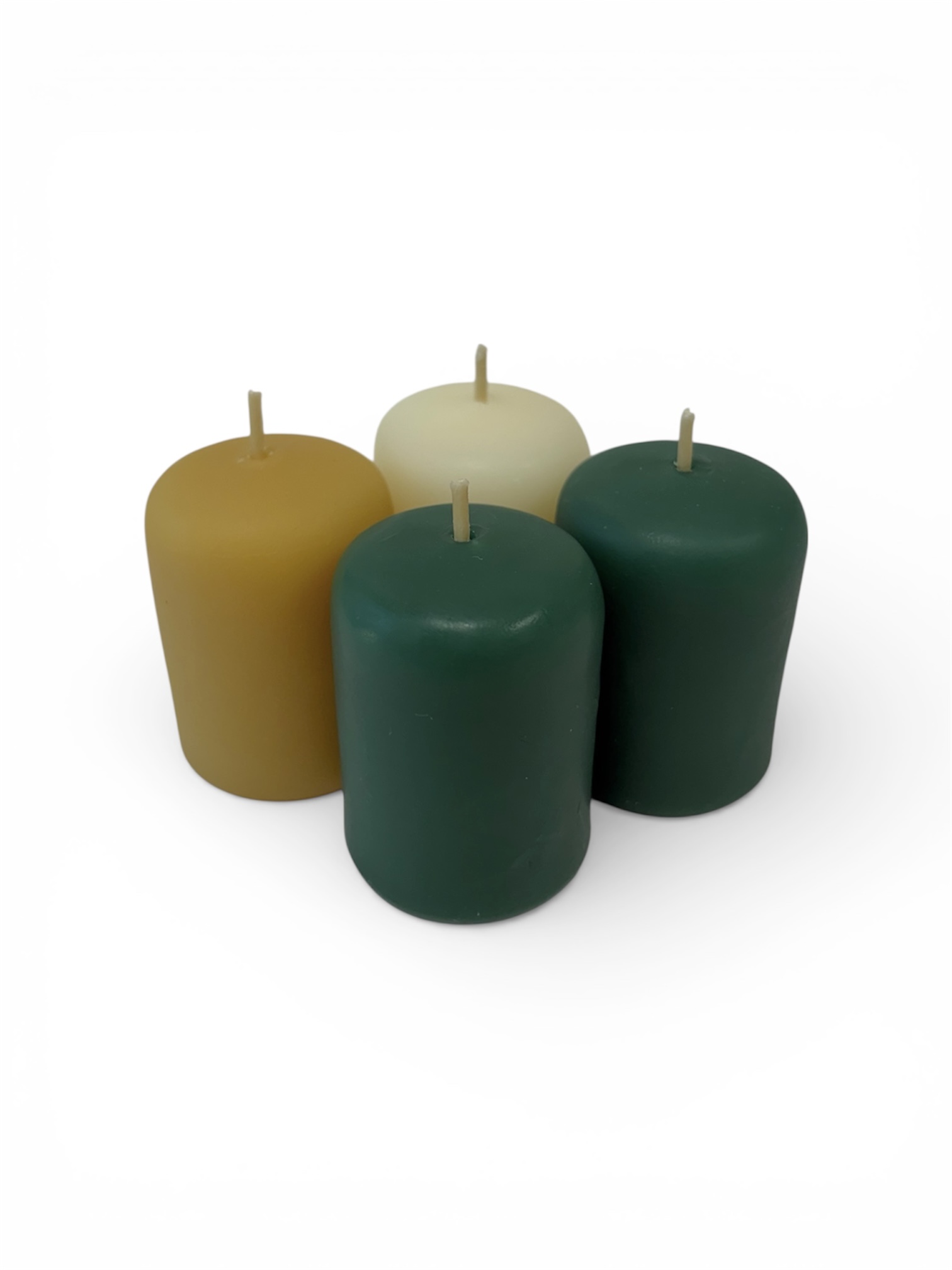 Our votives are made with 100% beeswax and a cotton wick. Sold in a set of 4, you will receive 1 ivory, 1 natural, and 2 green votives. They liquefy as they burn and must be placed in similar sized glass holders.